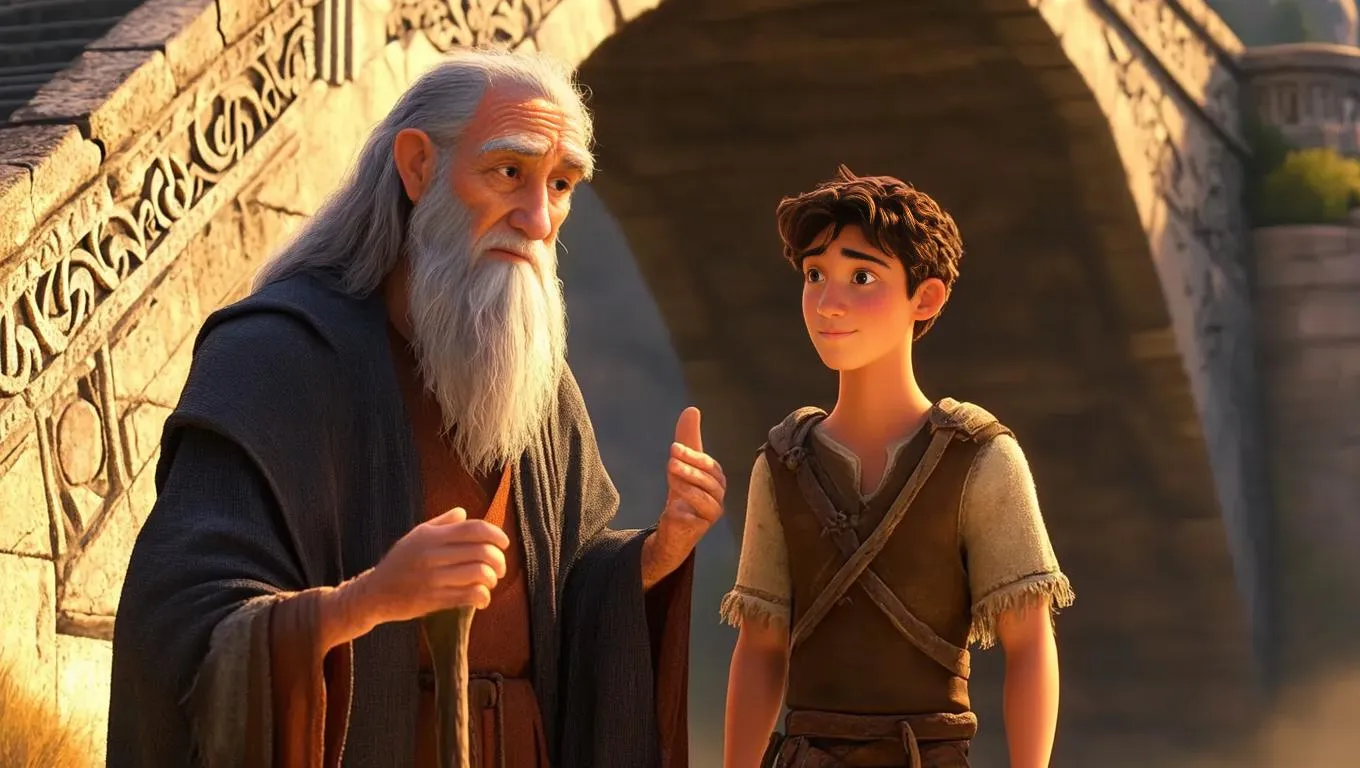 Create vibrant Pixar-style 3D HD scenes of a wise mentor and young protagonist at a majestic carved stone bridge. Perfect for storytelling, this AI-generated art captures mentorship, decision-making, and intricate fantasy landscapes. Ideal for animations, book covers, or character-driven narratives with lifelike emotion and professional-grade visual quality.