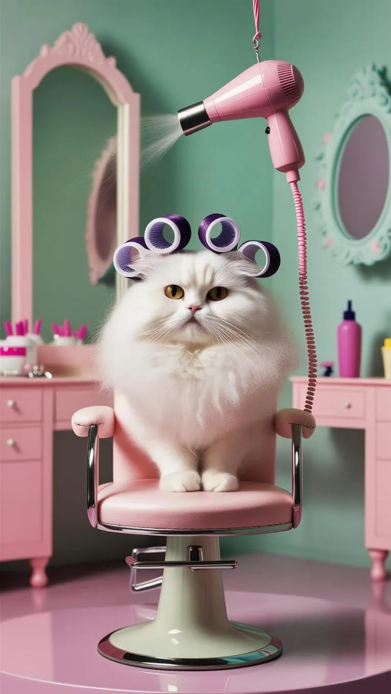 Generate a whimsical AI image of a fluffy white cat lounging in a tiny salon chair, wrapped in miniature curlers with a toy hairdryer overhead. Perfect for pet lovers and creative projects, vivago.ai transforms playful prompts into charming, high-quality visuals using advanced AI effects and text-to-image technology.