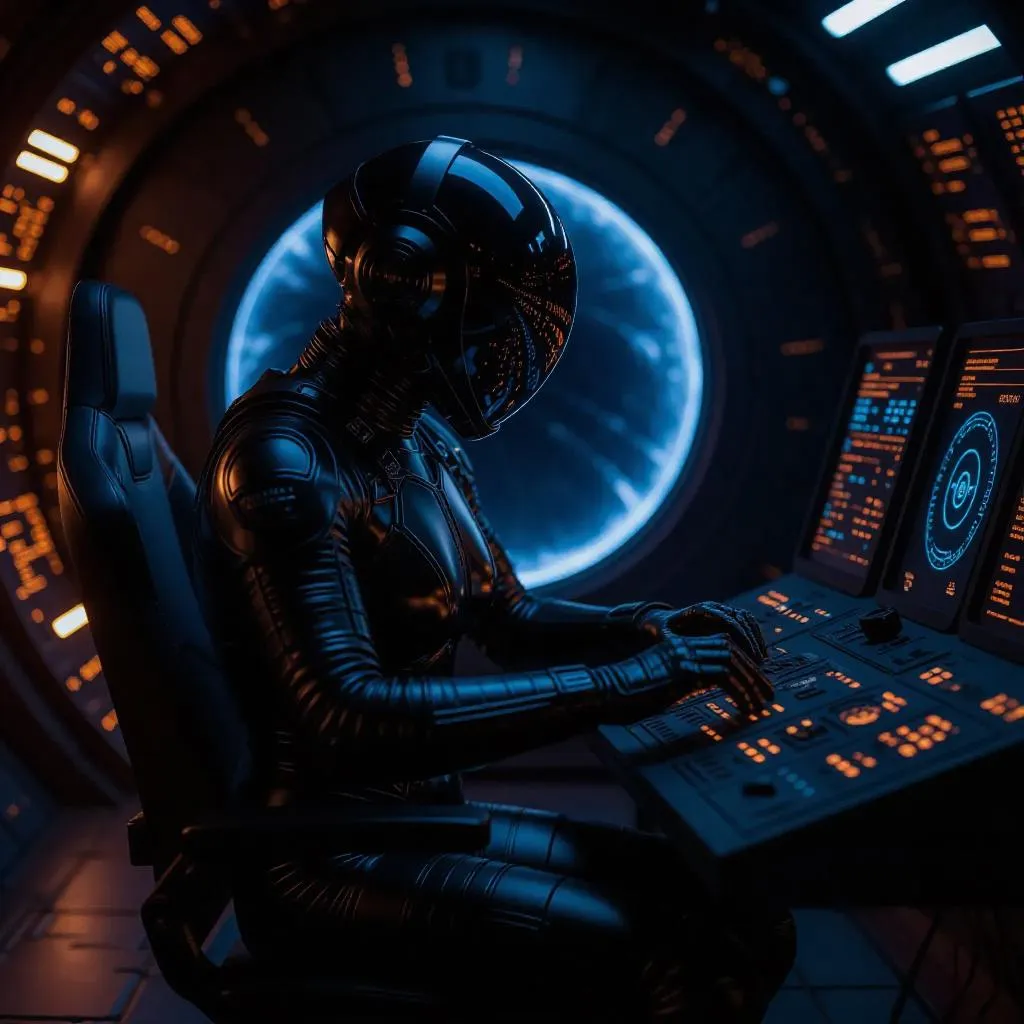 Generate a futuristic sci-fi scene with AI: mysterious humanoid operator in a sleek spacesuit interacts with a high-tech control panel featuring glowing holographic interfaces, analog dials, and vibrant neon lighting. Dark, textured cockpit contrasts with luminous blue-orange displays and a swirling energy portal nearby. AI-powered image creation for immersive concept art and professional sci-fi visuals.
