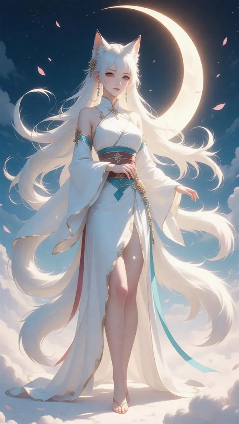 Celestial nine-tailed fox immortal in pristine white, silver hair cascading like starlight. Ancient divine aura swirls with peach blossom radiance, jade Qing Kunlun fan emitting mystical energy. Pearl-glowing tails dance through moonlit clouds, eyes mirroring eternal snow. Witness AI-crafted xianxia fantasy where celestial petals and flowing veils weave three-life love tribulations in breathtaking detail.
