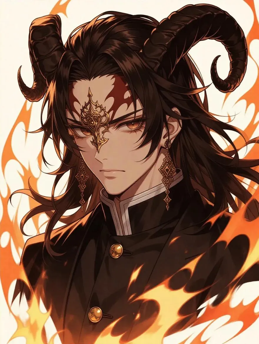 A drawing of a demon with horns and a demon face, adorned with an intricate demon mask, depicting a beautiful male god of death, handsome guy in demon slayer art, exuding elegance and power, with flowing dark hair and piercing eyes, set against a backdrop of ethereal flames.