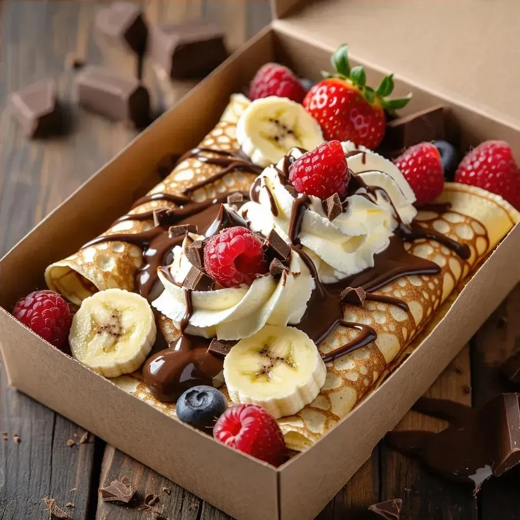 Transform your dessert vision into ultra-HD reality with AI-generated decadent crepe triangles filled with Nutella, strawberries, bananas, coconut, dark chocolate sauce, whipped cream, Crème Brûlée, and strawberry coulis. Achieve hyper-detailed, mouthwatering visuals for gourmet creations with ultra-high clarity and resolution.