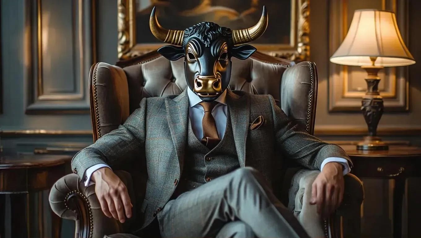Create a striking AI-generated image of a confident man in a crisp suit and bull mask, blending whimsy with formal elegance. Dark ambiance, warm lamp glow, and professional editing tools highlight the surreal fusion of sophistication and playful mystery. Perfect for artistic portfolios, event themes, or avant-garde storytelling with AI-powered creativity.