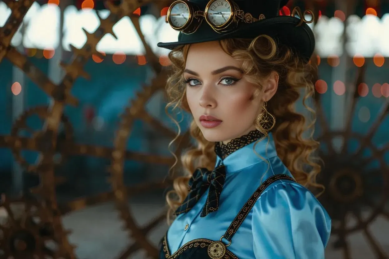 Create a stunning steampunk-inspired image with a bold, curvy blonde woman in gothic makeup and intricate circus attire. Featuring glowing flashes, detailed gears, and a dynamic steampunk arena backdrop. Perfect for AI-generated realism, blending fantasy aesthetics with professional editing tools for immersive visual storytelling.