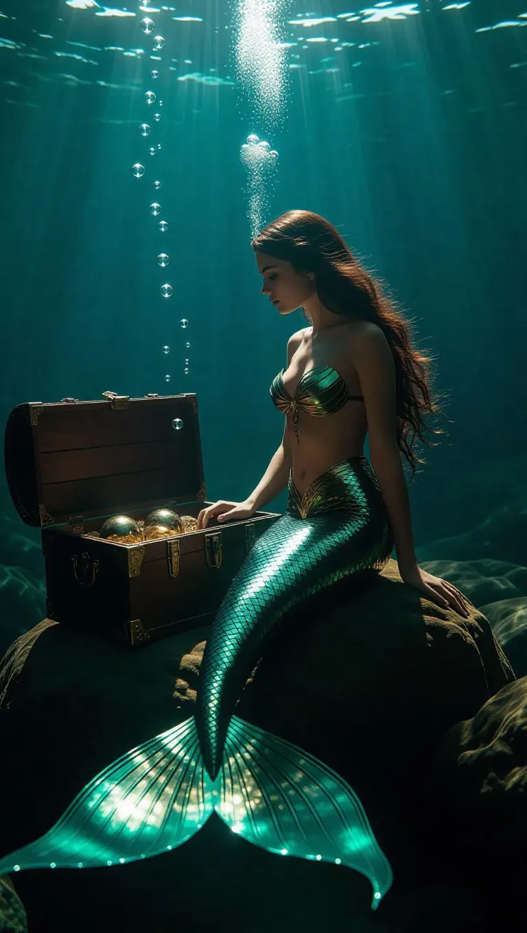 Deep in the mystical teal waters, a graceful mermaid with a golden tail sparkles in the ethereal underwater light, resting beside an ancient treasure chest. Delicate bubbles float upward like tiny pearls, capturing a magical moment of discovery as she examines her newfound treasure, blending fantasy and wonder in this enchanted marine setting.