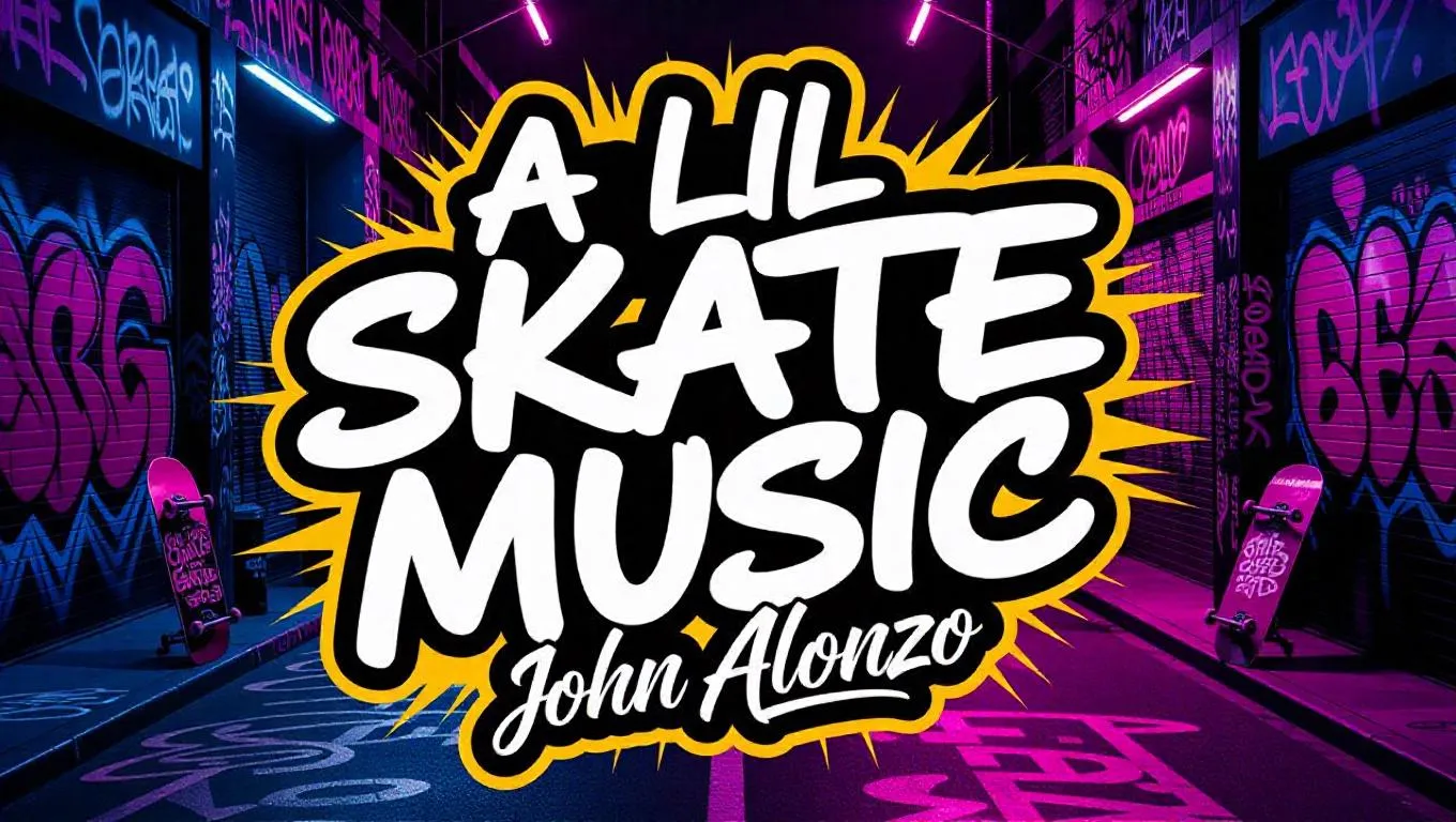 Create a dynamic AI-generated album cover for "A Lil Skate Music" by John Alonzo. Vibrant graffiti aesthetics blend with retro skate culture, featuring bold typography for the title and artist name. Edgy, urban energy meets playful AI creativity—perfect for capturing viral attention. Customizable visuals powered by vivago.ai’s professional tools.