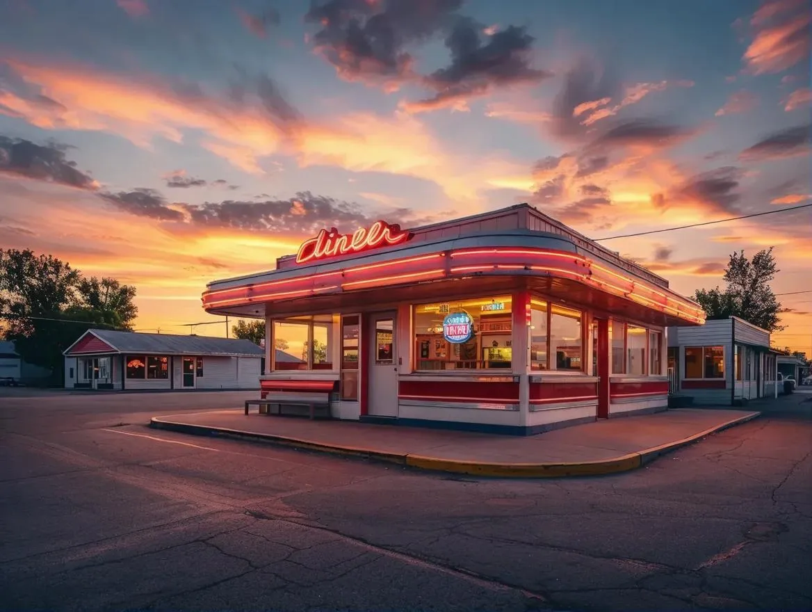 Transform your vision into AI-generated visuals with our low angle shot effect, capturing a cozy diner in a quaint small town at golden hour. Elevate content with stunning sunset imagery and professional photography effects. Create cinematic, nostalgic scenes effortlessly using Vivago.ai's advanced AI tools.