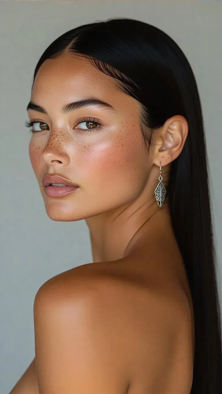 Stunning minimalist AI portrait of a 40-year-old African-Asian woman with sharp cheekbones, dark hair, and a tribal septum ring. High-contrast lighting highlights facial contours against a plain grey backdrop. Explore AI tools for realistic, culturally rich portraits and professional-grade editing.