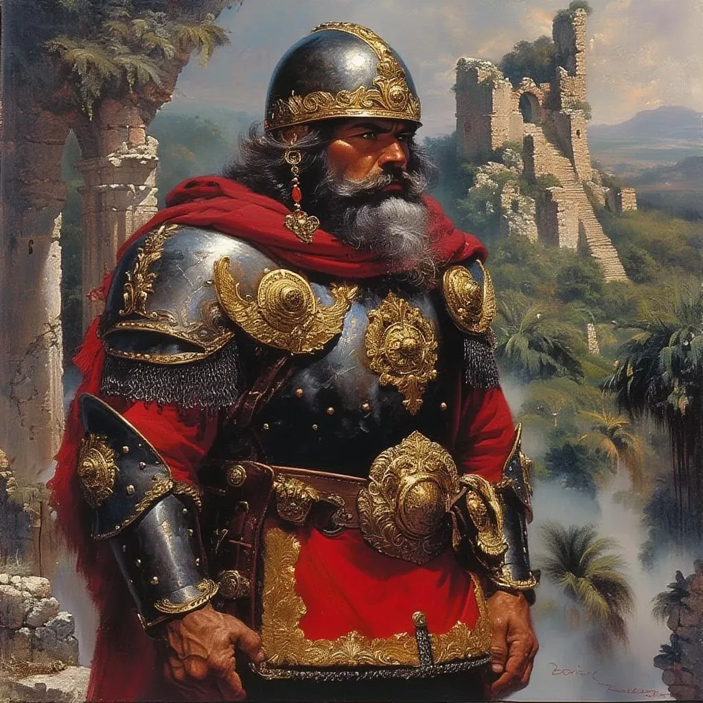 Create stunning AI-generated fantasy art inspired by Boris Vallejo and Frank Frazetta. This oil-painted portrait features a detailed male dwarf Spanish Conquistador in red-black armor, wearing a Mytholon Alberto Morion helm. Heavy brushstrokes and intricate textures bring this mythical warrior to life with Vivago.ai's advanced AI tools for professional-grade visuals.