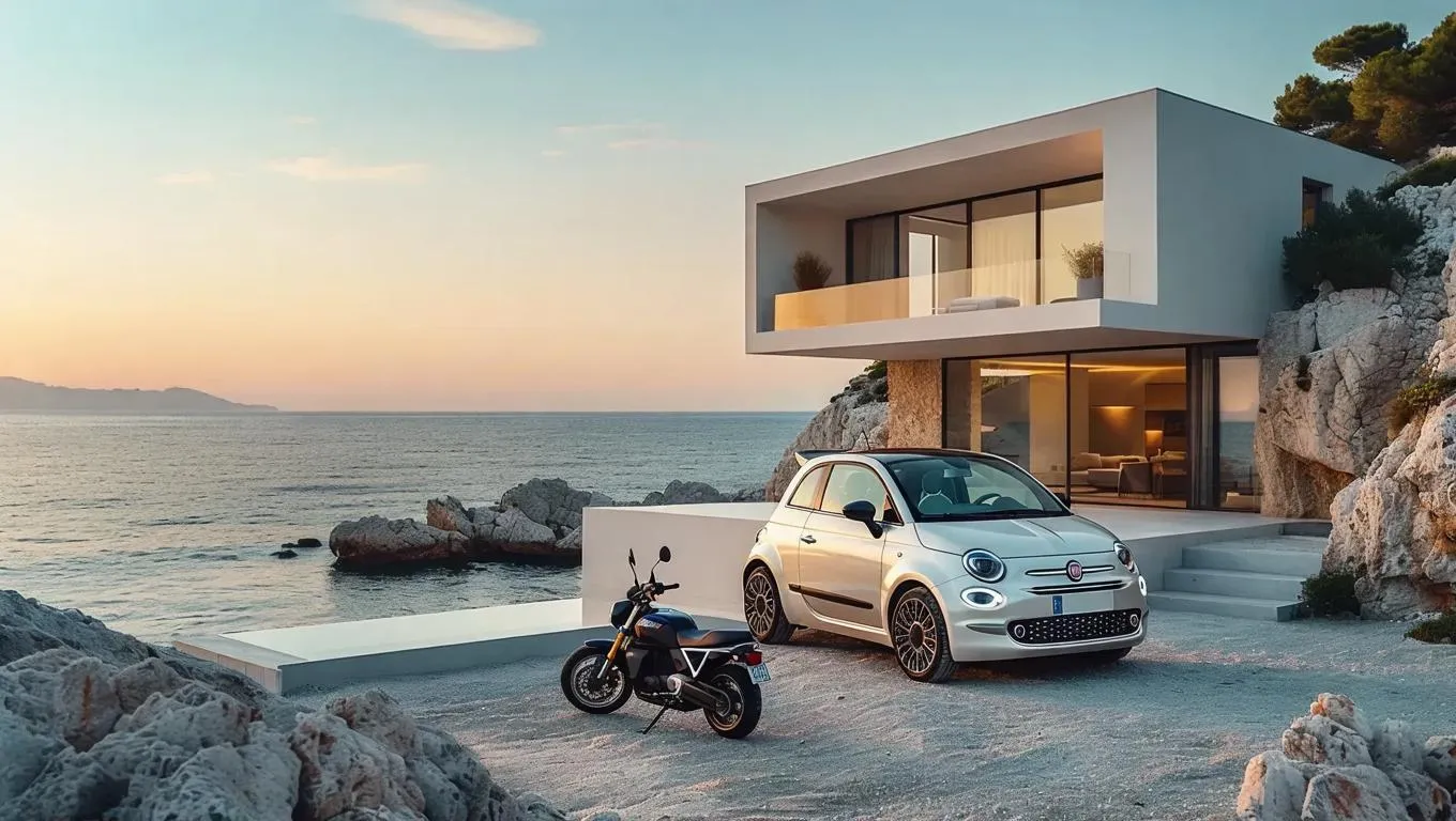 Transform your vision into AI-generated imagery with Vivago.ai. Create a chic coastal house near a rocky beach, featuring a vintage Fiat 500 and modern electric motorcycle. Perfect for dynamic visuals, ads, or storytelling—leverage AI-powered tools for professional-grade, vibrant designs that blend retro charm with eco-friendly innovation. Elevate your creative projects effortlessly.