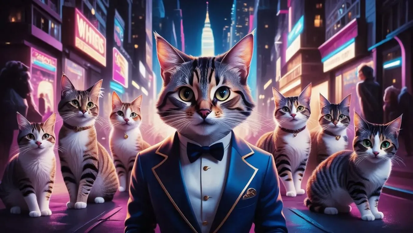 Discover AI-generated images of Whiskers, a sleek, adventurous cat exploring vibrant city nightlife. Vivago.ai crafts dynamic visuals of confident feline charm, stylish interactions, and unique personalities. Elevate storytelling with AI effects for vivid, imaginative scenes—perfect for creative projects blending urban allure and playful character design.