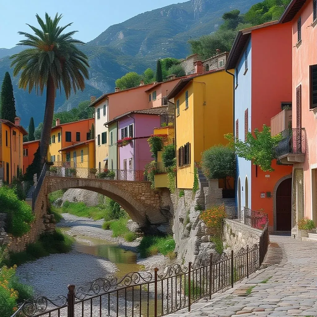 Generate a charming Italian village scene with pastel houses, stone bridge, and Mediterranean mountain backdrop using AI. Create picturesque European scenery with rustic architecture, quaint streets, and vibrant colors for stunning vertical visuals. Perfect for AI-generated travel and design inspiration.