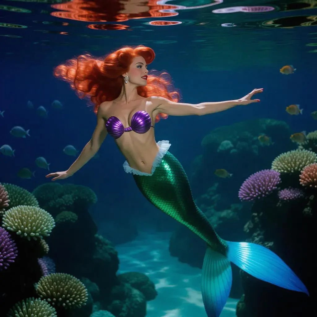 Transform text into stunning visuals with vivago.ai's AI image generator. Create Catherine Missal as Ariel (1989) – a Caucasian mermaid with red wig, purple shell bra, green tail, blue eyes, and floating hair. High-definition, vibrant colors, and lifelike details for professional-grade AI art.