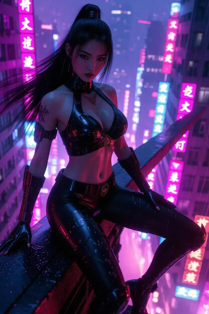 Generate realistic full-body art of cyberpunk Mulan perched on a neon city skyscraper. Witness her vibrant crimson prosthetics, plasma katanas, and razor hairstyle reflecting holographic dragons. Experience ultra-high resolution action as matte black drones attack below her hydraulic boots. #VivagoAI