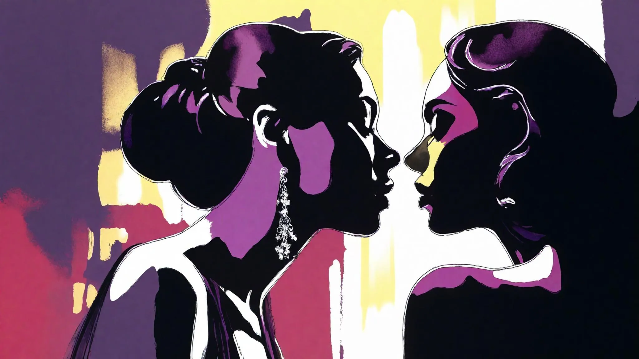 Create striking AI-generated vector art of two women in muted tones (black, light/dark purple, white) with ink painting effects and chiaroscuro contrast. Transform text prompts into professional visuals using vivago.ai's curated tools for modern, minimalist illustrations with dramatic vector art styles.