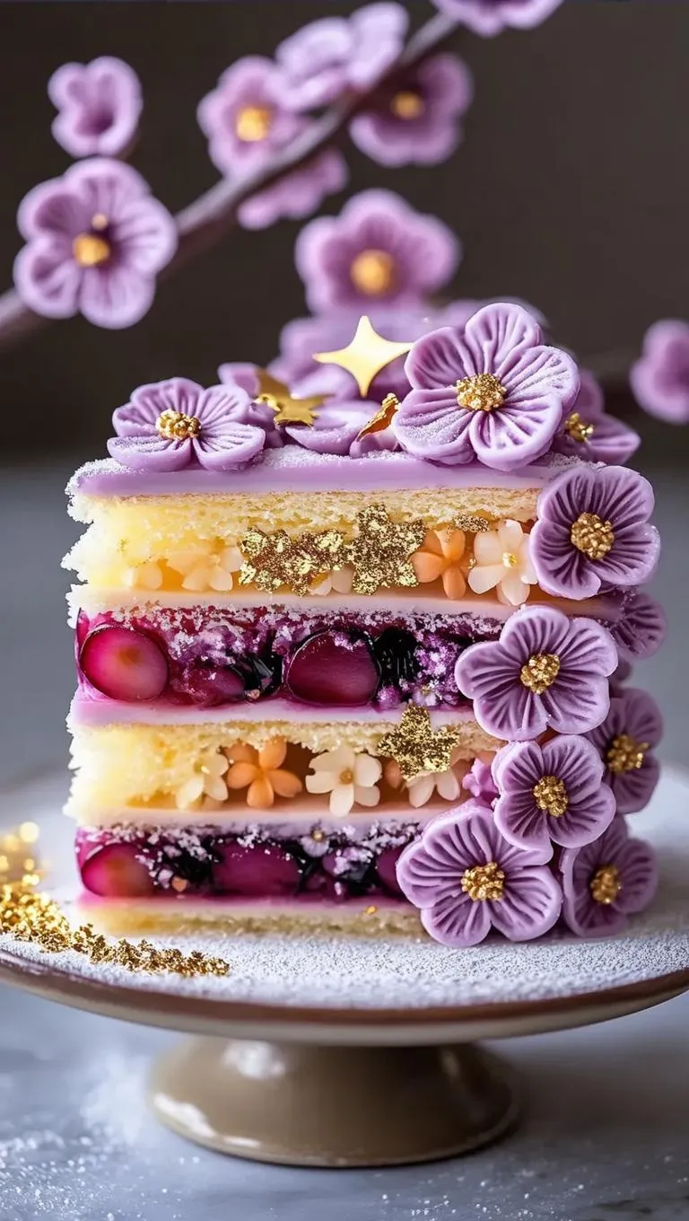Intricate minute thousand flower motifs designs. Close up photograph of a slice of layered cake with a Pale-purple-cherry blossom theme, a layer of fruit filling between cake layers, decorated with sun shaped designs, with intricate frosting and beautiful details. Vibrant colour. Beautiful colour combination, x-ray print. Minute Designs , Intricate flower motifs. Dusted with sugar powder. Gold Flakes.