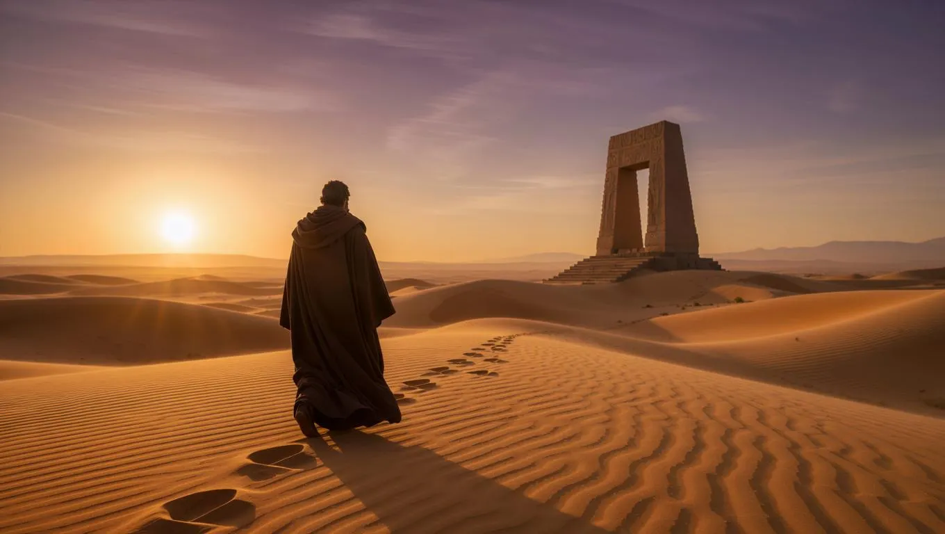 Craft cinematic, hyperrealistic visuals with AI: a robed figure traverses rippling dunes toward a monolithic structure, bathed in golden rim light. Photorealistic sand grains, fabric details, and vast violet-orange skies evoke "Dune"-inspired desert spirituality. Hollywood-grade precision for social realism narratives—transform prompts into razor-sharp, immersive scenes with Vivago.ai's AI image tools.