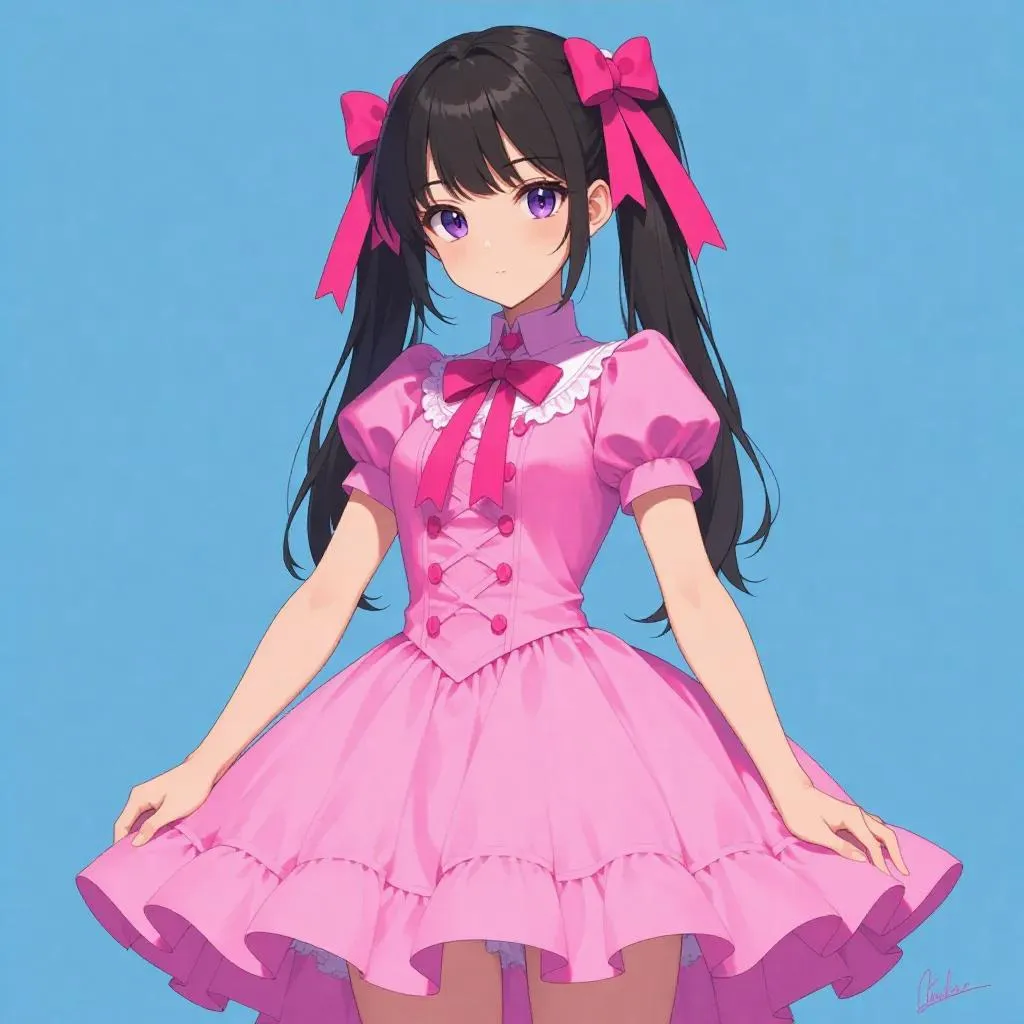 Create AI-generated anime art of a girl in a pink dress with ribbons, blending Applecore, Berrypunk, and post-painterly styles. Transform text into 32K UHD visuals with fanciful costume designs for professional-grade, multi-style anime characters using advanced AI image generation tools.