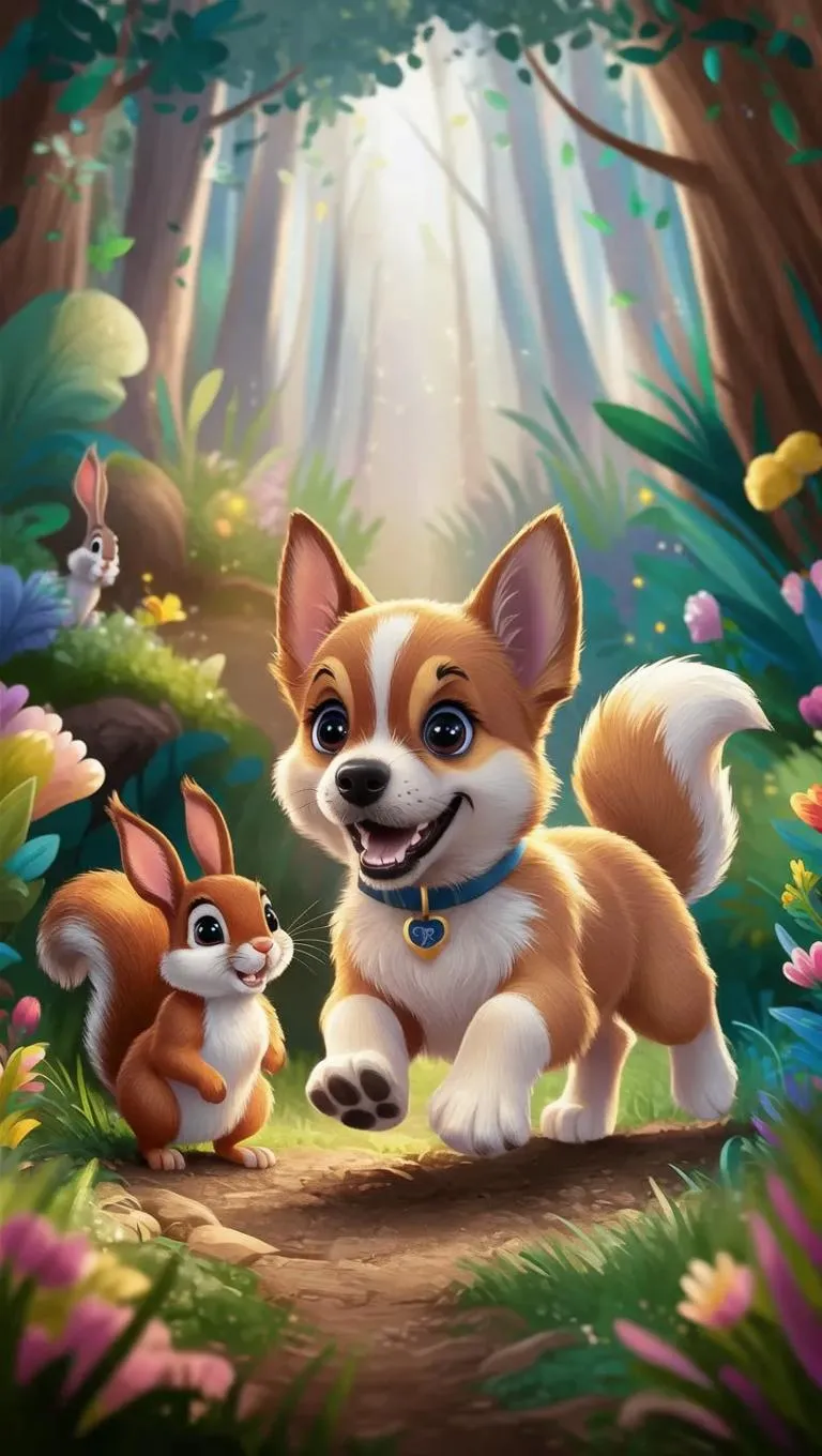 Create a whimsical children's book illustration with AI! Generate a cartoon-style forest scene where a playful puppy meets curious squirrels and rabbits. Perfect for story continuation, vivid colors, and friendly characters spark imagination. Ideal for authors seeking enchanting, AI-generated visuals with Vivgo.ai's creative tools.