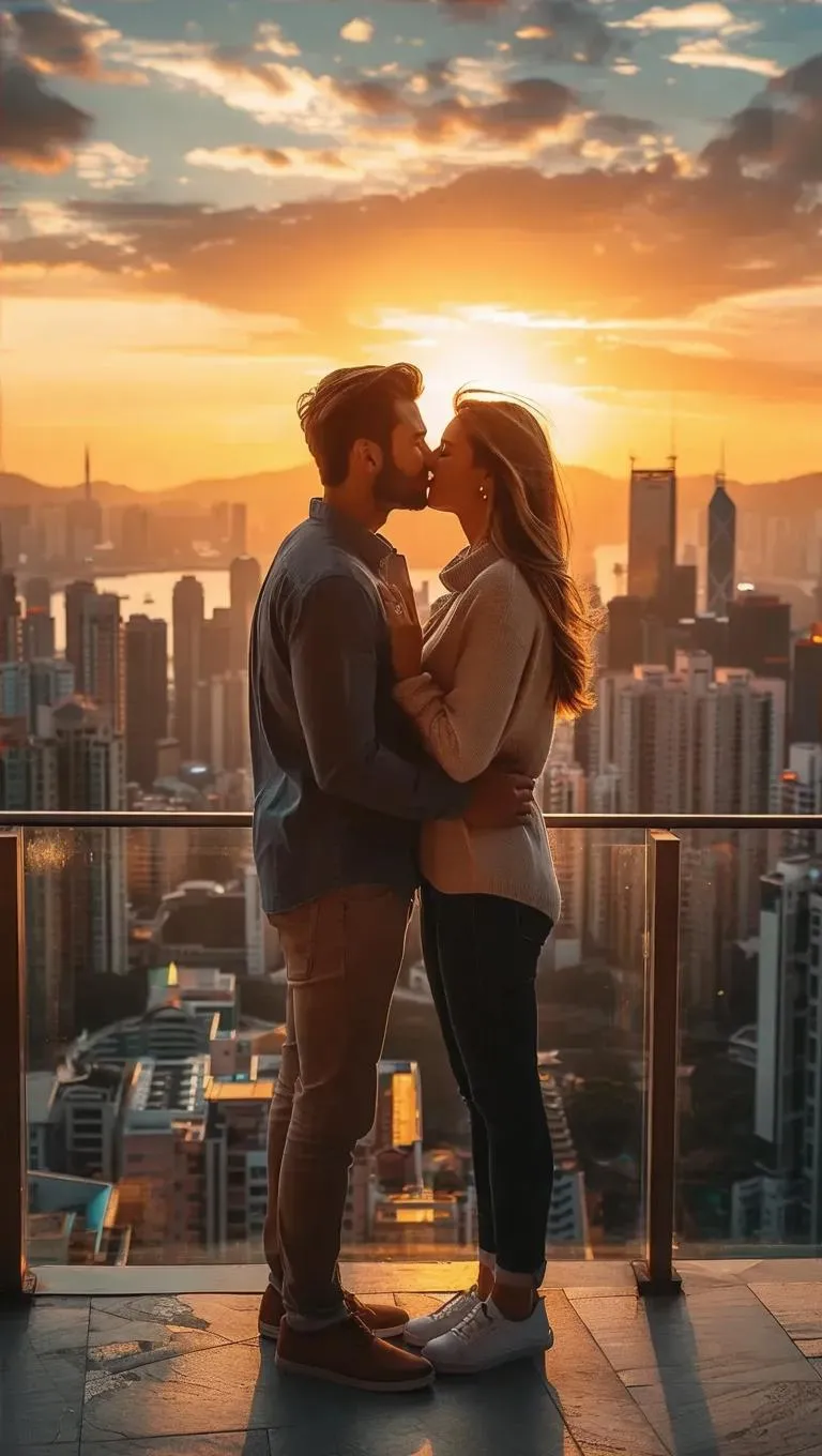Create mesmerizing AI-generated visuals of a couple kissing over a sunset cityscape with Vivago.ai. Transform text prompts into romantic, professional-grade images/videos using curated AI effects and editing tools for breathtaking, shareable moments.
