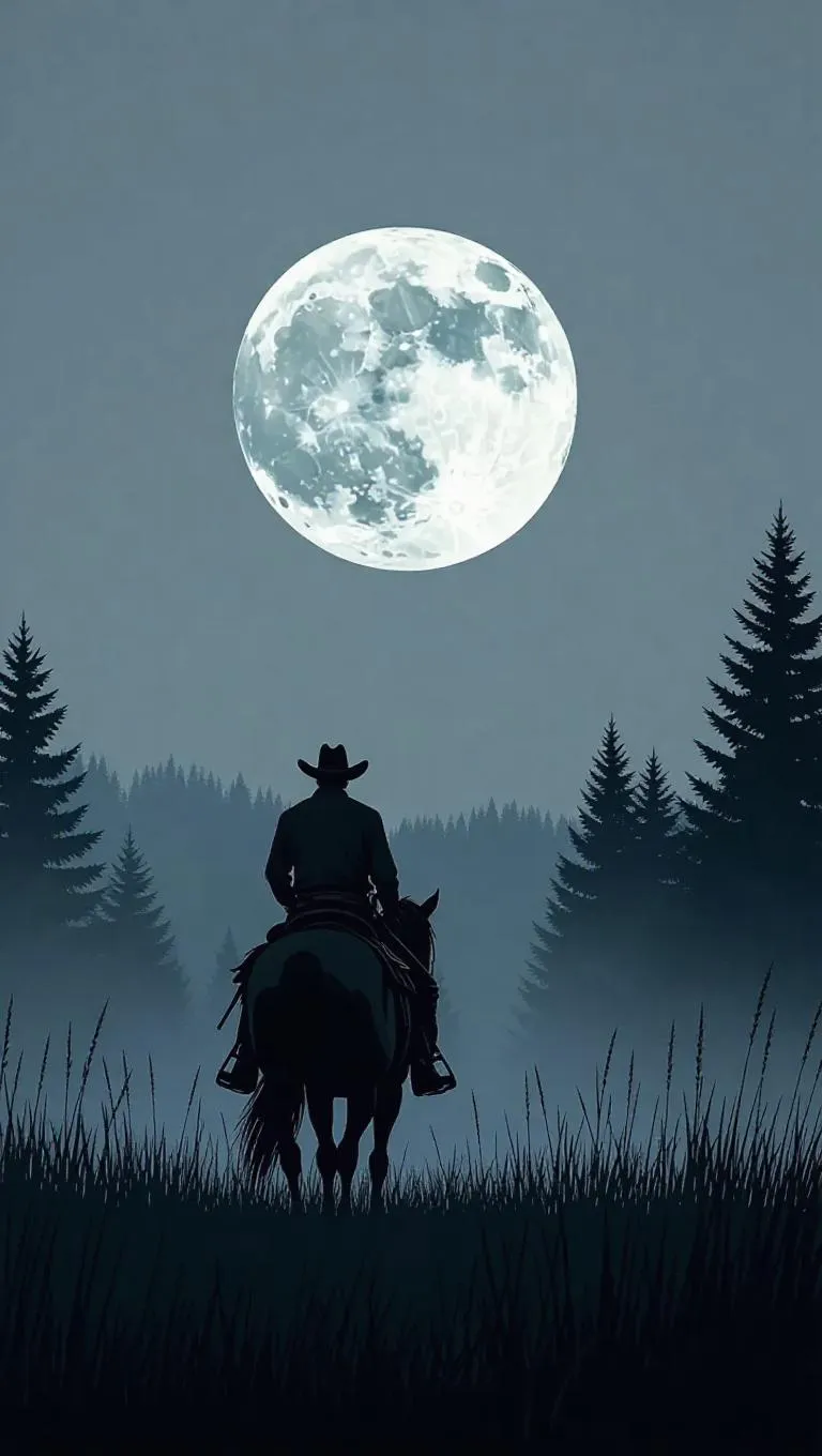 Create a cinematic AI-generated digital painting of a lone cowboy in a misty night scene. Featuring stylized game-like graphics, low-angle perspective, and dramatic light contrast. Silhouetted rider against a moonlit sky with muted blues, grays, and atmospheric fog. Perfect for evoking mystery, isolation, and cinematic storytelling with AI art tools.