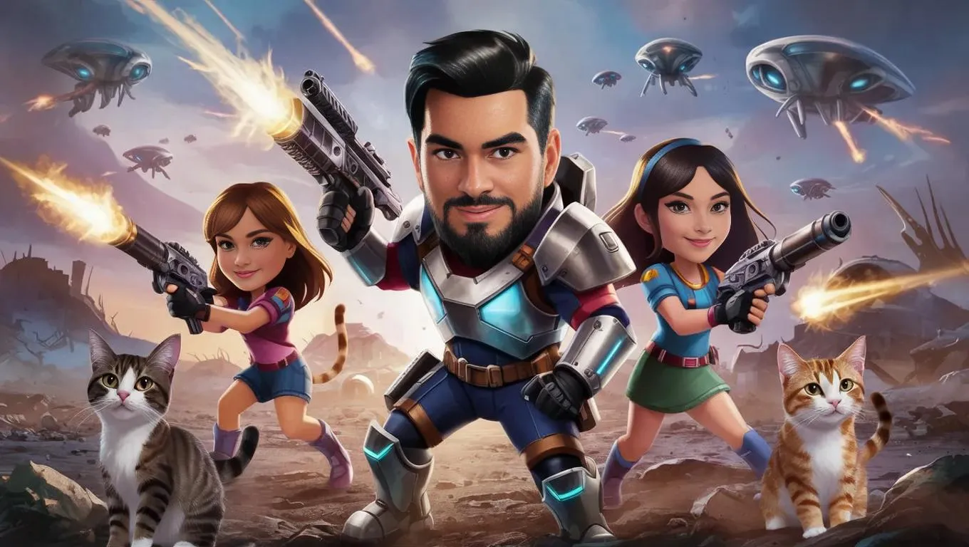Generate a quirky AI cartoon scene featuring a black-bearded hero and two brunettes in futuristic armor defending cats against alien invaders during the apocalypse. Vibrant comic-style visuals merge sci-fi action with humorous animal rescue themes for engaging digital storytelling.