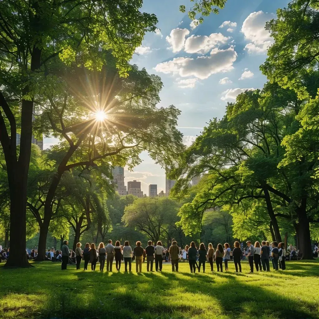 Capture unity in a serene outdoor scene with soft sunlight filtering through clouds. AI-generated image of thoughtful individuals in a peaceful park or plaza, symbolizing collective awareness and harmony. Craft inspiring visuals of engaged communities with VivaGo's AI tools for professional-grade, calming imagery that embodies connection and mindful collaboration.