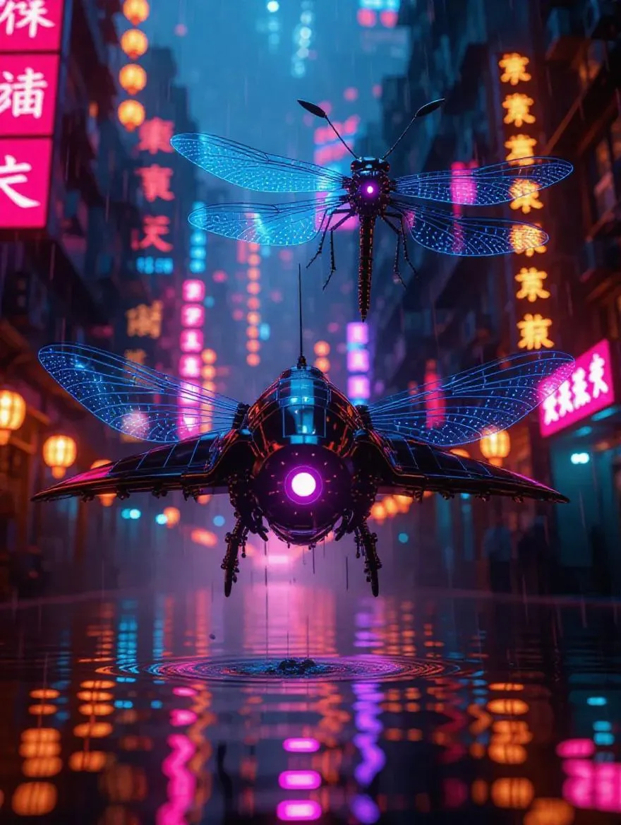 Generate a futuristic AI fantasy image of the Panopticon Parasitic Stingray with transparent helicopter-propeller wings, cyborg mech elements, and a luminous bokeh-lit cityscape. Experience divine beauty through volumetric light, vivid colors, and surreal details like flowing pools and a central eye—crafted by AI tools for breathtaking, professional-grade visuals.