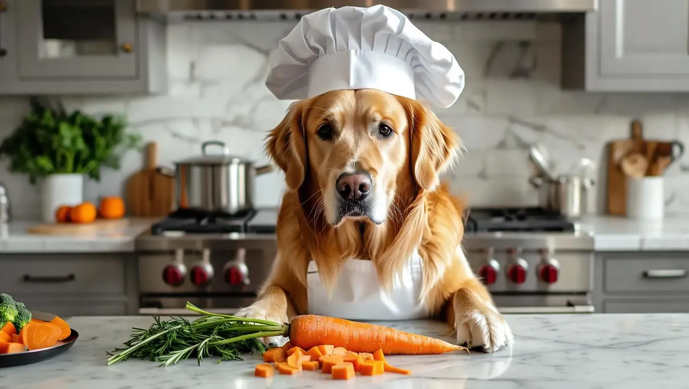 Generate a playful AI image of a golden retriever chef in a cap and apron cooking carrots using vivago.ai’s creative tools. Transform text prompts into charming, professional visuals with AI effects and precision editing for vibrant, whimsical content.