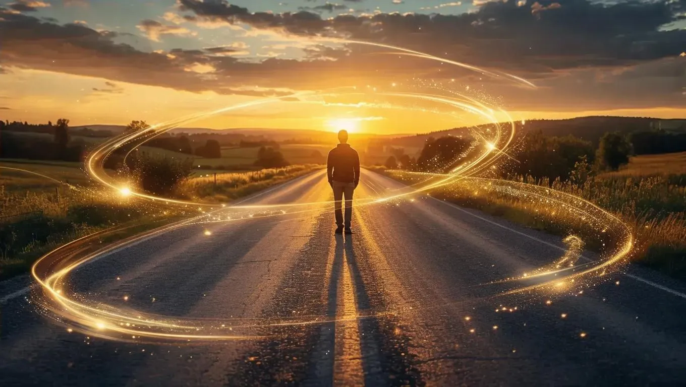 Generate surreal twilight scenes with a man gazing back on a quiet road, blending illusion, wind motion, and ethereal light effects. Transform text prompts into atmospheric visuals using VivaGo.ai's AI tools for professional-grade image/video creation and mystical ambiance.