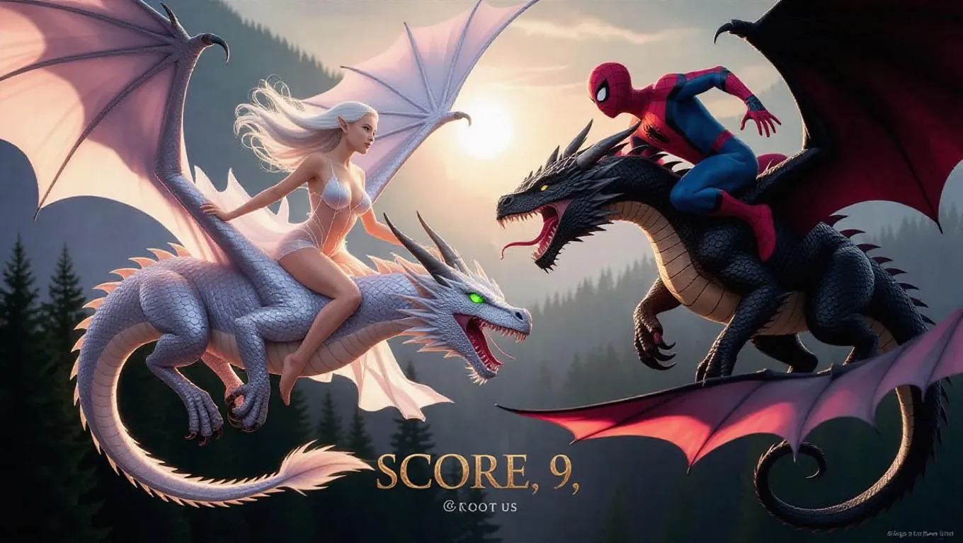 "score_9, score_8_up, score_7_up, an elven girl with long white hair, pointy ears, and glowing green eyes rides a radiant silver dragon through a mystical forest sky. Her sheer, see-through dress flows in the wind, revealing underboob and sideboob, her glowing skin framed in soft light. Her hourglass figure and large breasts shimmer as the dragon lets out a deafening roar. Opposite her, Spider-Man clings to a massive obsidian-scaled dragon, red-and-blue suit flaring with tension. The two dragons spiral around one another, wings slicing the mist, claws crashing in mid-air, magical fire exploding between them. Ethereal sparks rain down on the ancient forest below. NSFW, solo, fantasy art, highly detailed, high contrast, film grain, 8k. Cinematic wide shot, dynamic camera angles capturing the intense aerial battle."