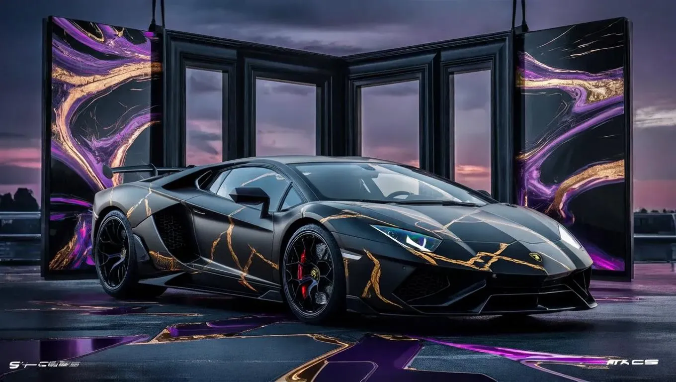 Captivating Lamborghini wallpaper scene featuring a grand, oversized frame showcasing a sleek, dark luxury supercar. Enhanced with gold cracks, swirling purple marbled streaks, and a twilight backdrop, exuding cinematic power and elegance. Perfect for high-end automotive enthusiasts and dynamic visual storytelling.