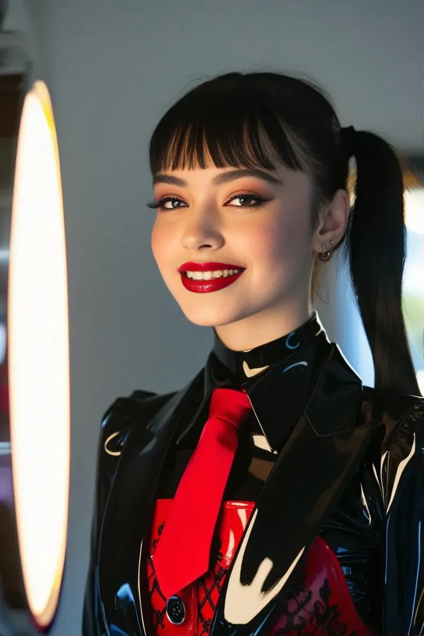 Step into the spotlight with this AI-crafted gothic waitress in a radiant makeup room. Glossy black latex, bold red corset, and daring makeup exude confident allure. Sleek double ponytails, playful smiles, and charismatic eyes amplify her joyous charm. Generate striking latex-fashion visuals with vivago.ai’s AI tools for professional, eye-catching imagery.