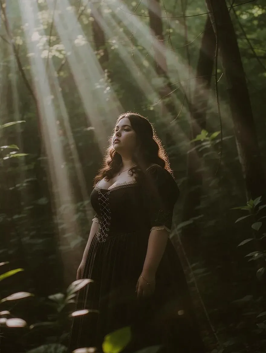 Alex Webb capturing a 12-year-old plus-sized overweight Greek brunette, Francesca Woodman, in a tight-fitting medieval dress, standing amidst a dense, mystical forest. Shot with a Canon EOS R7 camera, the scene exudes a haunting, ethereal atmosphere with dappled sunlight filtering through the canopy.