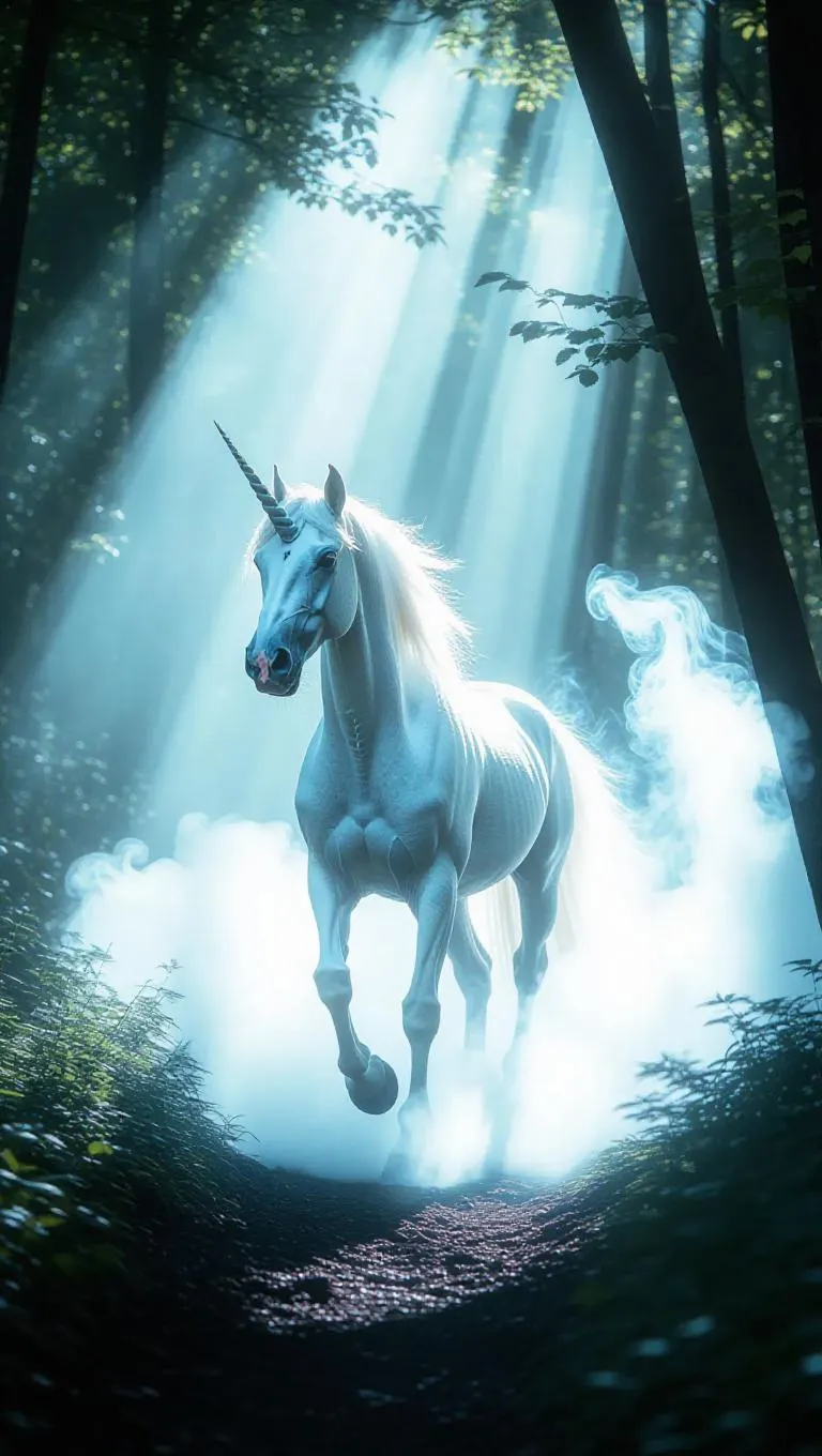 Create a cinematic enchanted forest scene with kaleidoscopic lighting, a mystical white unicorn in magic smoke, and glittering atmosphere. Vivago.ai transforms your prompts into stunning AI visuals with ethereal effects and mystery.