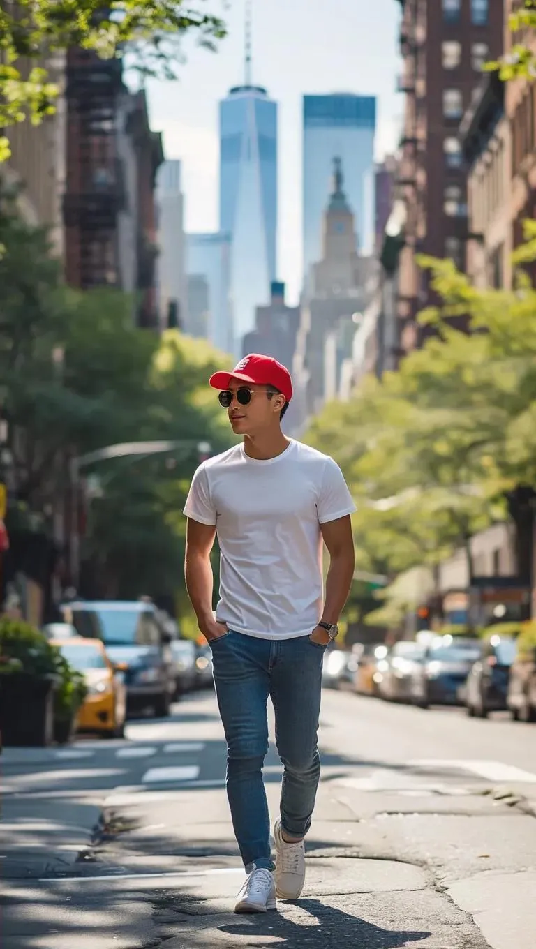 Capture lifelike AI visuals of a youthful Asian man in a red baseball cap and sunglasses strolling NYC streets. Vivago.ai crafts realism with Canon EOS R5 35mm lens precision, soft sunlight, and candid intimacy. Elevate creative projects with detailed facial features, lush greenery, and iconic skyline backdrops for professional-grade AI-generated imagery.