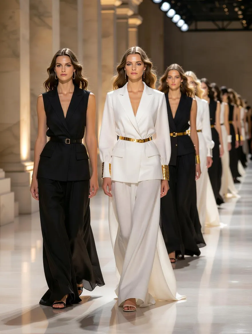 AI-generated runway show: Greek-inspired black and white linen dresses with classical drapery meets modern tailoring. Crisp lines evoke ancient chitons against marble. Golden belts, laurel wreaths & sculptural jewelry accessorize. Serene, powerful models under spotlights highlight textures. Experience timeless elegance reimagined with AI fashion generation. Create this ethereal collection.