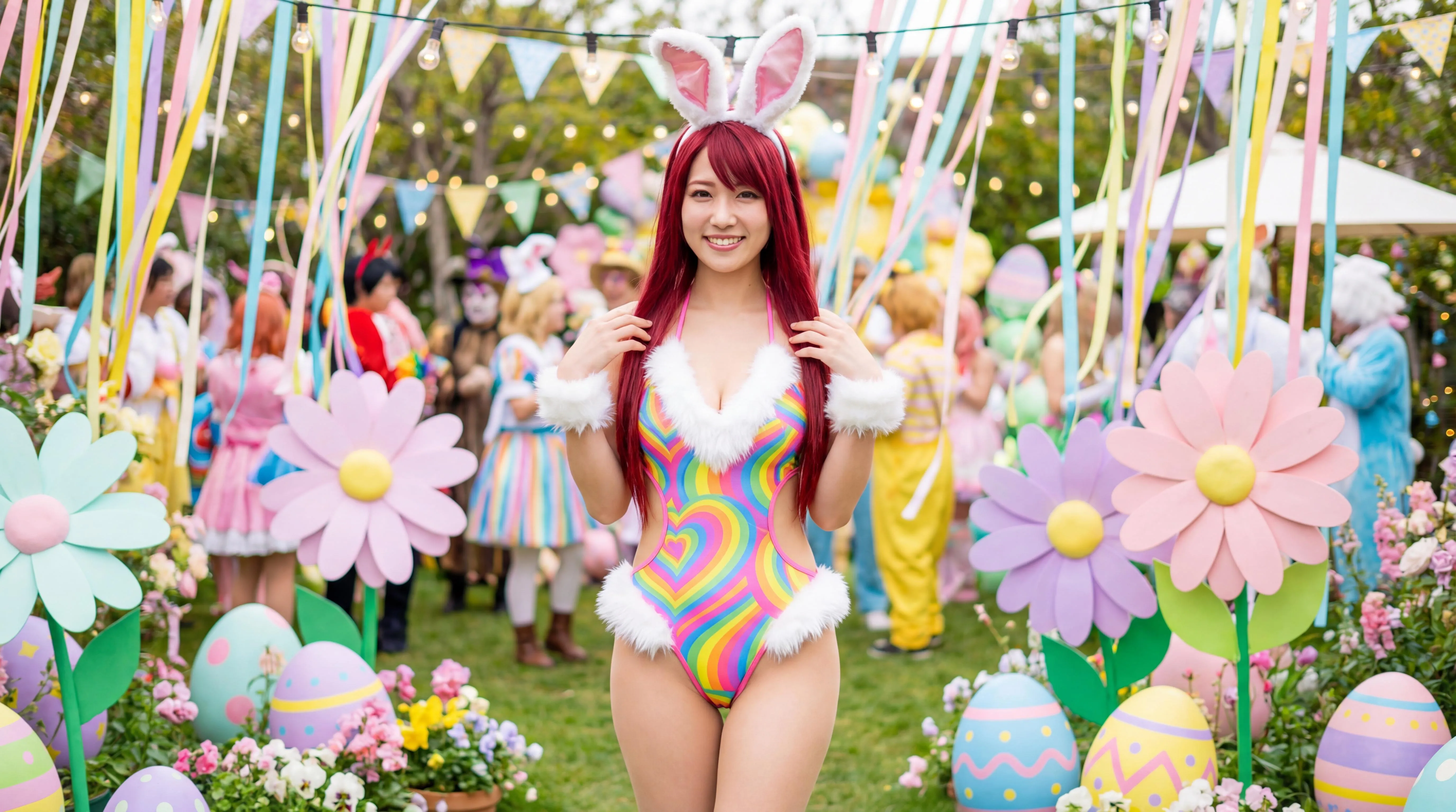 Full-body image of a stunning, very slim red-haired Japanese woman with voluptuous breasts in a skimpy, provocative, skin-tight Easter bunny macrokinis featuring thin white fur strips, vibrant colors, playful bunny ears, sparkling eyes, and a mischievous smile. Set against a lively, festive, and lascivious Easter background with vibrant flowers, pastel hues, and decorative eggs, alone and unbothered.