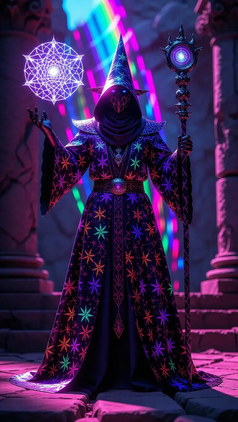 Generate mystical AI art of a masked wizard conjuring prismatic lizards from a kaleidoscopic vortex. Explore fractal energy, arcane symbols, and vivid amethyst hues with bioluminescent dragonflies in a psychedelic, reality-bending scene. Transform text into mesmerizing visuals via AI image generation, blending chromatic crystals, stardust mist, and kaleidoscope-eyed familiars for spellbinding fantasy creations.