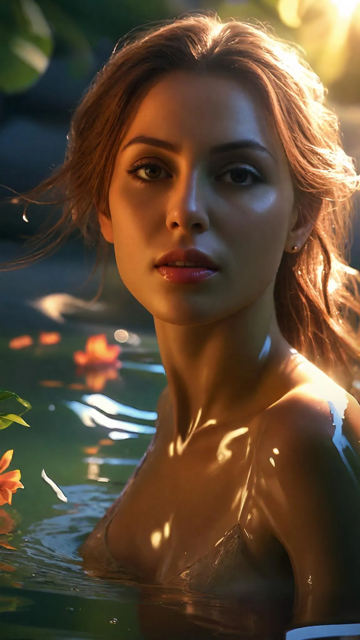 Naked woman with big breasts, waist-deep in water, photorealistic, detailed facial features, sensual expression, relaxed pose, sunlight reflecting on water, lush nature surroundings, dramatic lighting, high quality, 8k, ultra-detailed, professional, vivid colors, physically-based rendering, serene atmosphere, natural flora, crystal-clear water, soft shadows.