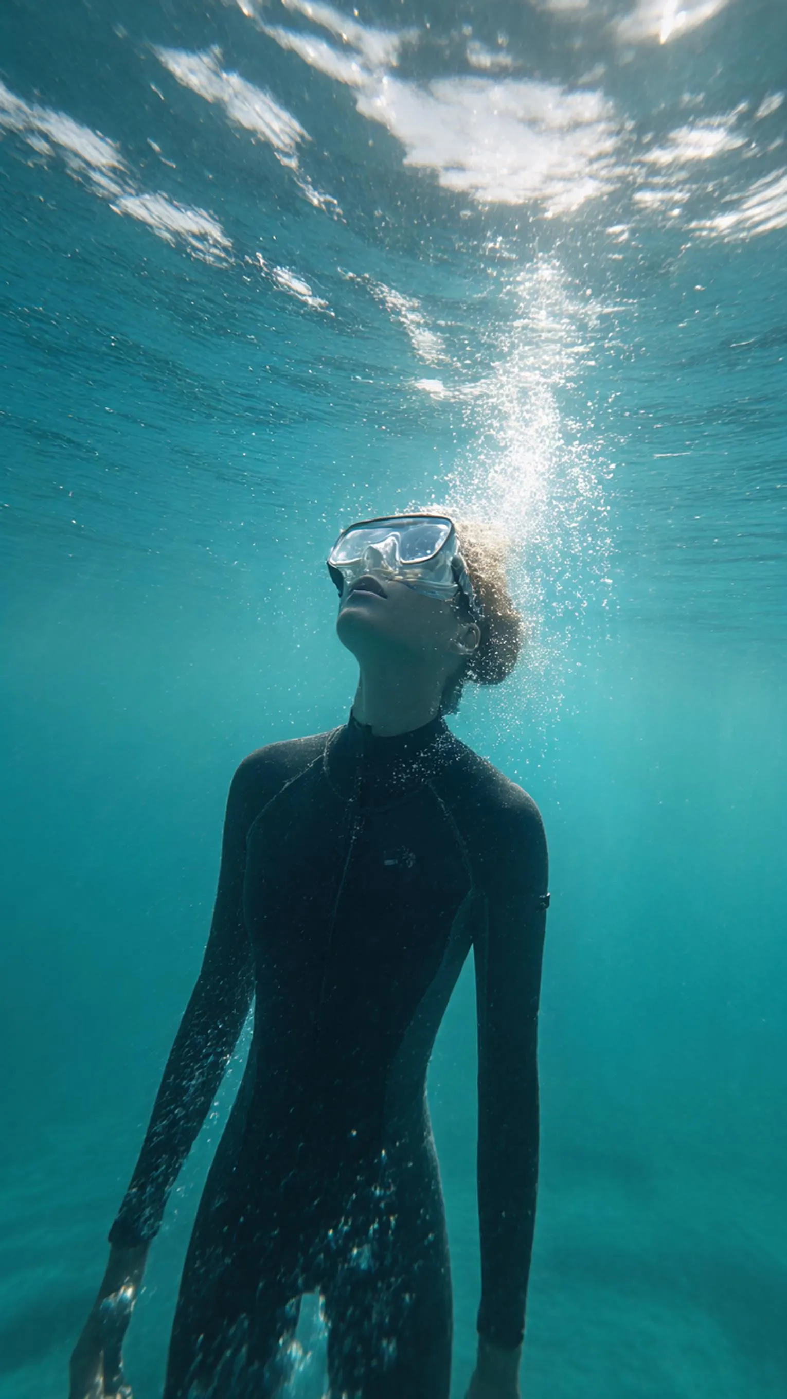 Create stunning AI-generated underwater photography with vivago.ai. Visualize turquoise ocean scenes gazing toward the sunlit surface. Transform this text prompt or your own image into vivid marine imagery. Explore professional AI tools for captivating ocean visuals.
