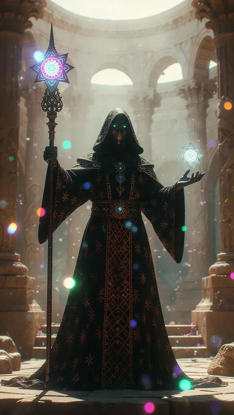 Generate mystical AI art of a masked wizard conjuring prismatic lizards from a kaleidoscopic vortex. Explore fractal energy, arcane symbols, and vivid amethyst hues with bioluminescent dragonflies in a psychedelic, reality-bending scene. Transform text into mesmerizing visuals via AI image generation, blending chromatic crystals, stardust mist, and kaleidoscope-eyed familiars for spellbinding fantasy creations.