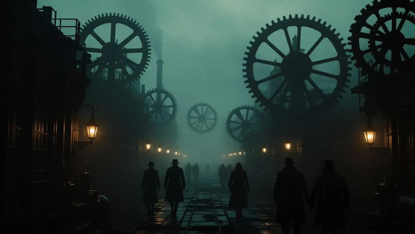 Steampunk wasteland with an eerie, almost uneasy atmosphere, people navigate through dense, smoky haze, surrounded by rusted machinery and towering gears, dimly lit by flickering lanterns, creating a sense of foreboding and mystery.