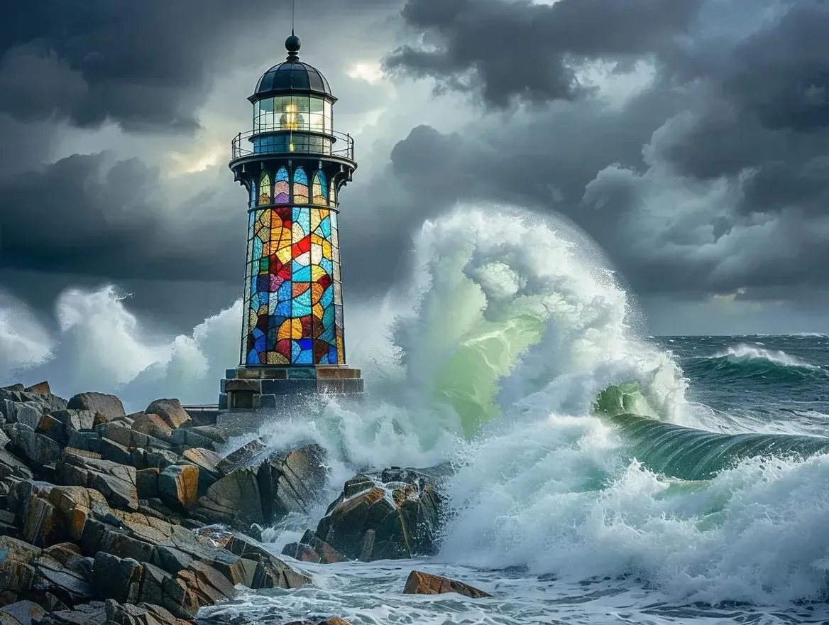 Transform your lighthouse images into vibrant stained glass art with vivago.ai's AI effect. Generate luminous designs, intricate patterns, and vivid colors for professional visuals. Elevate creative projects using text prompts or reference images with AI-powered stained glass transformations.