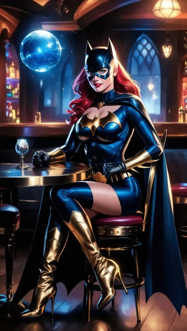 Discover AI-generated Batgirl visuals with sleek dark blue and gold nanotechnology armor, glowing orb, and medieval bar backdrop. Featuring long red hair, golden boots, cape, and high-tech details. Craft professional superhero scenes using Vivago.ai's advanced AI tools for striking, futuristic character designs.