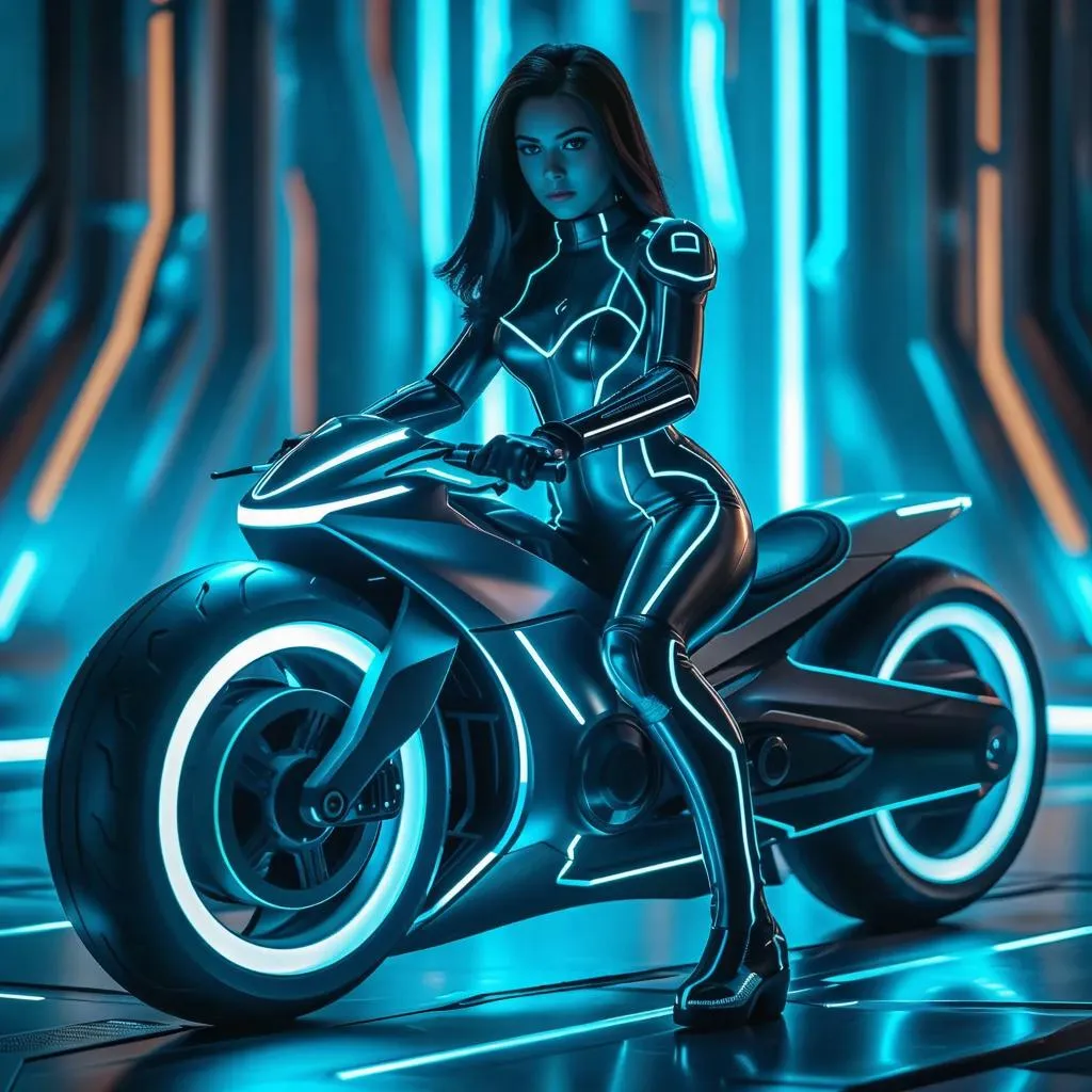 Create a TRON-inspired AI-generated image of a sleek, sexy female character with a neon-lit lightcycle. Perfect for cyberpunk enthusiasts, this futuristic design combines vibrant visuals and dynamic poses, crafted by AI for high-quality, customizable sci-fi art.
