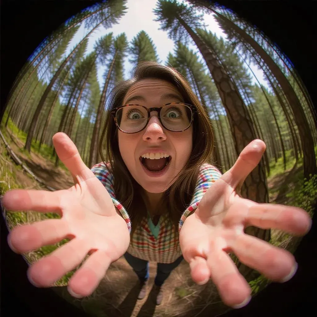 Generate captivating fisheye lens visuals with VivaGo AI. Achieve strong central distortion where a lively, smiling character greets the viewer, magnified amidst a vivid forest backdrop. Create unique, exaggerated perspective photos and realistic AI art. Try this AI fisheye effect now!