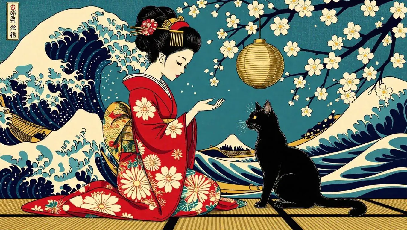 Create AI-generated ukiyo-e art blending Edo-period aesthetics with modern graphics. Transform text into vibrant scenes of kimono-clad girls, mischievous bakeneko cats, and traditional woodblock textures. Bold outlines, bokashi shading, and dynamic compositions bring traditional Japanese art to life. Explore AI effects for professional-grade visuals on vivago.ai.
