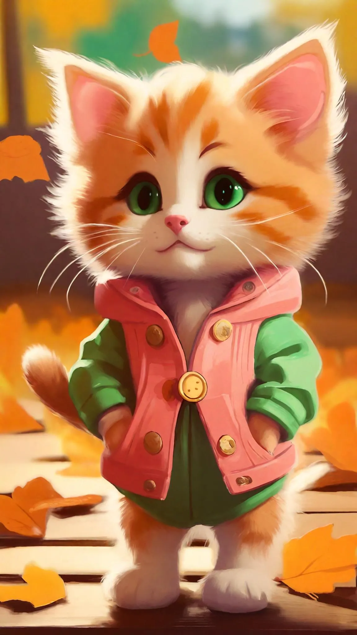 AI-generated image of a playful kitten dancing in autumn park scene, featuring orange-and-white cat with green eyes wearing pink jacket and brown pants amidst fallen leaves. Charming digital art with "AI Cat Dance" text, showcasing vivago.ai's creative AI effects for whimsical pet visuals.