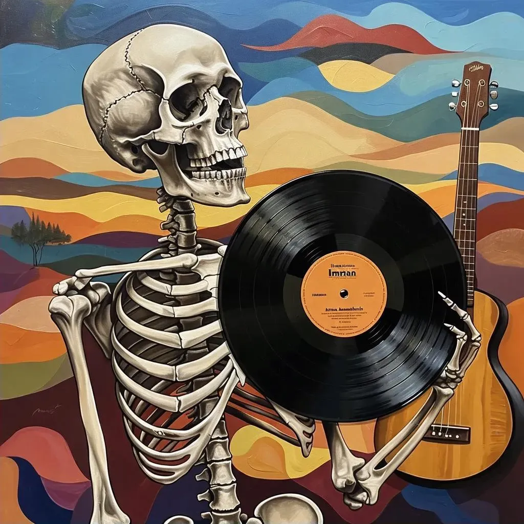 Generate a vibrant AI image of a cheerful skeleton holding an Imran Ahmedn vinyl record, set against an abstract landscape with a guitar. Explore vivago.ai's AI effects for surreal, professional-grade visuals, blending music, art, and creativity in unique image generation.